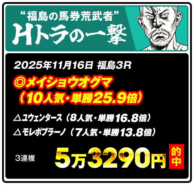 先週は福島からHトラが挨拶代わりに532倍。3歳2月の新馬戦から馬券に絡んだことが無い6歳セン馬メイショウオグマ(10人気・単勝25.9倍←爆穴)に本命とはシビれたね~。