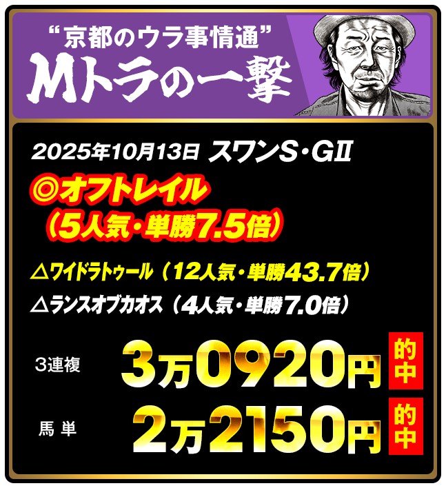 「(馬主の)幅田昌伸オーナーは京都の人。ワイドラトゥールは過去にもオーナー地元開催の京都で勝負仕上げを施されて勝った実績があるし、主戦のキタトモ(北村友J)に手が戻る今回は成績に目をつぶって買い目に入れておいた方がいい!」