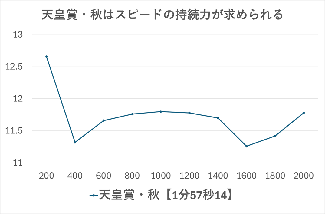 まずは、この表を見て欲しい。天皇賞・秋の過去5年の平均ラップだ。最初の1ハロンが12秒台で、それ以降はゴールまで11秒台で推移している。